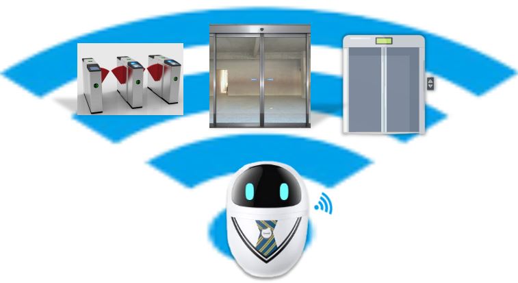 機(jī)器人通過WIFI、4G、Lora等通訊方式,發(fā)送指令實(shí)現(xiàn)開門、過閘機(jī)、呼梯、乘梯等。